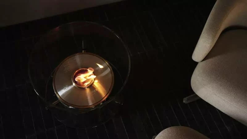 A smaller floor or side lamp-style fire with an industrial modern design, the portable, freestanding Pillar 3L allows you to create a unique and edgy aesthetic in indoor architectural spaces. Pairs beautifully with contemporary furniture and instantly transforms your interior, providing warm ambience. Choice of natural materials including timber with real Oak veneer, Italian Carrara marble or Turkish Nero Portoro marble for the base, with brushed brass trim and bracket accents breaking up the finish. A clear lamp shade-style Borosilicate glass fire screen surrounds the round stainless burner, which is also available with optional black ceramic coating.